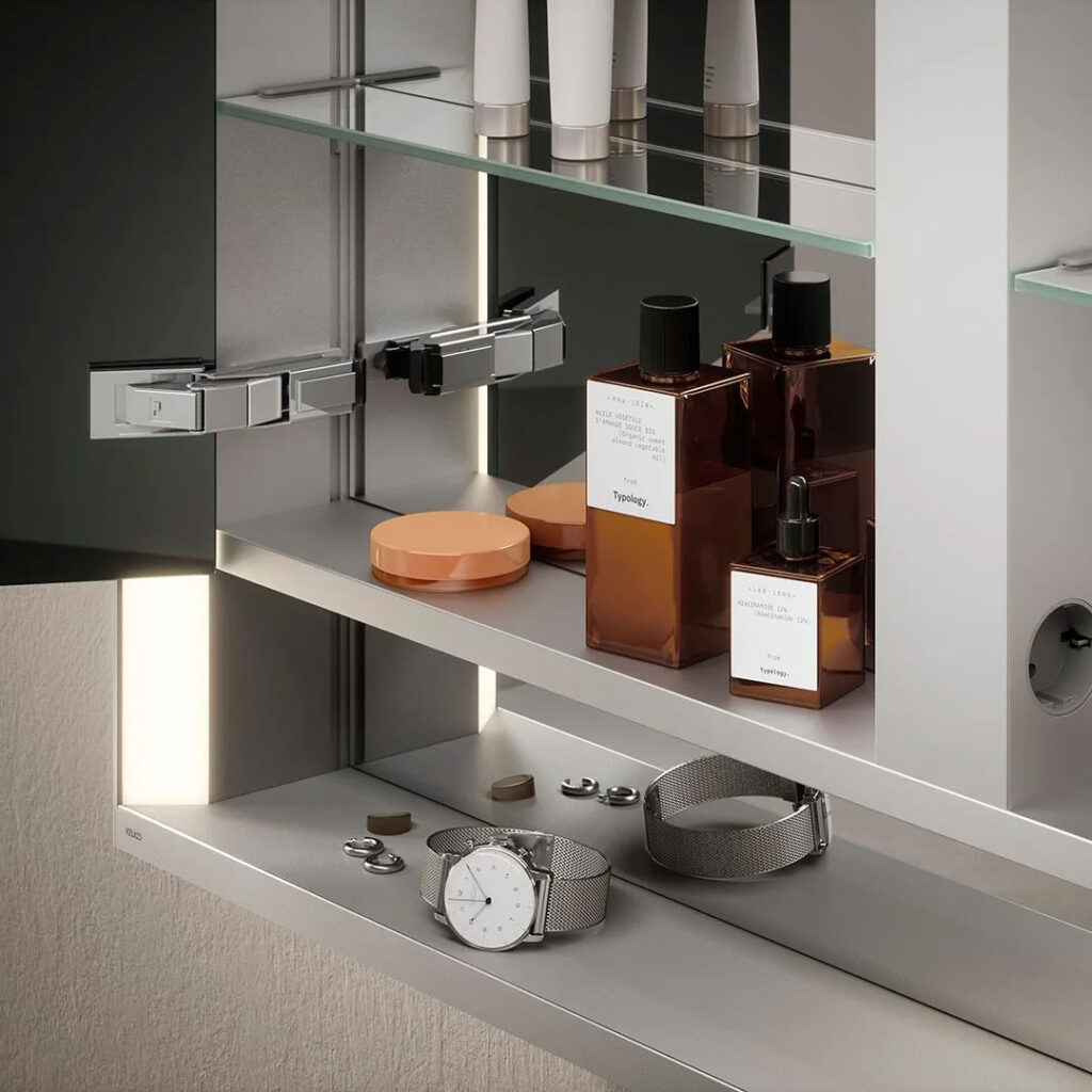 Eine hochwertige Innenausstattung mit soft-close Scharnieren, beleuchtetem Ablagefach mit rutschfestem und reinigungsfreundlichem Linoleumeinleger, verspiegelter Rückwand, innen verspiegelten Drehtüren sowie Steckdosen machen den ROYAL LUMOS einmal mehr zu einem beliebten täglichen Begleiter im Bad. Der ROYAL LUMOS ist optional mit integrierter Heizung in den Spiegeltüren ausgestattet. So ist eine beschlagfreie Sicht nach dem Duschen immer garantiert – auch in fensterlosen Bädern.
